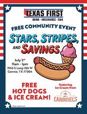 Come join us for Free Hot Dogs and Ice Cream!! Texas First Bank and Insurance Community Stars, Stripes, and Savings Event! Featuring Ice cream from Carousel's Soft Serve Icery!